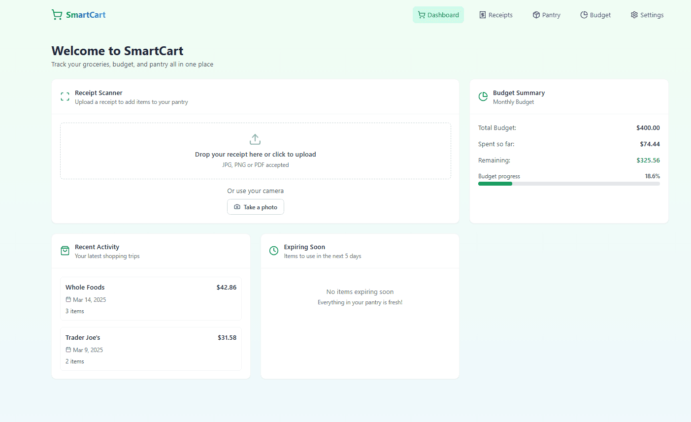 A comprehensive grocery management system that uses OCR to scan receipts and track spending habits. Features include pantry inventory management, recipe suggestions based on available ingredients, and real-time budget visualization through an interactive dashboard. (Backend in Development)